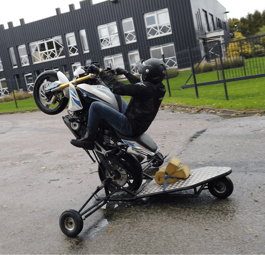 Nous mettons à disposition des motos BMW performantes (F800, G310, S1000) pour garantir une expérience optimale. De plus, notre stabilisateur breveté pour l’apprentissage du wheeling permet aux participants de s’initier à cette figure spectaculaire sans risque.